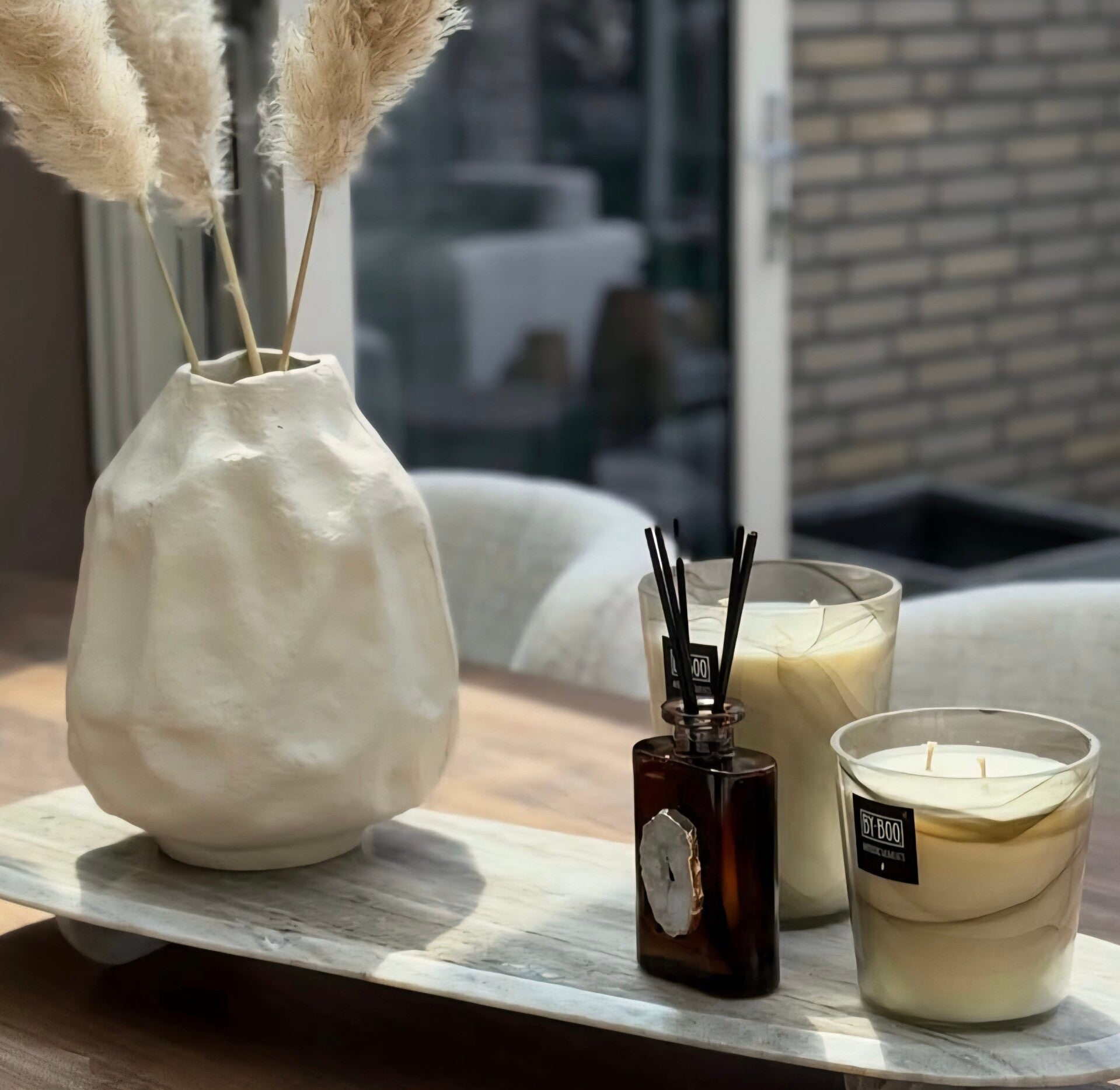 Elk product bevat een met de hand geslepen bergkristal, dat niet alleen een prachtige eyecatcher is, maar ook een bron van positieve energie en balans voor je interieur. De geur van Amber staat bekend om zijn warme en verfijnde aroma, ideaal voor het creëren van een gezellige en stijlvolle ambiance.